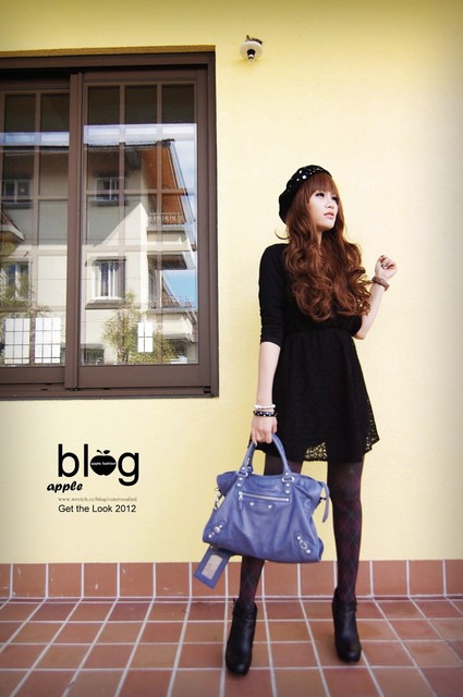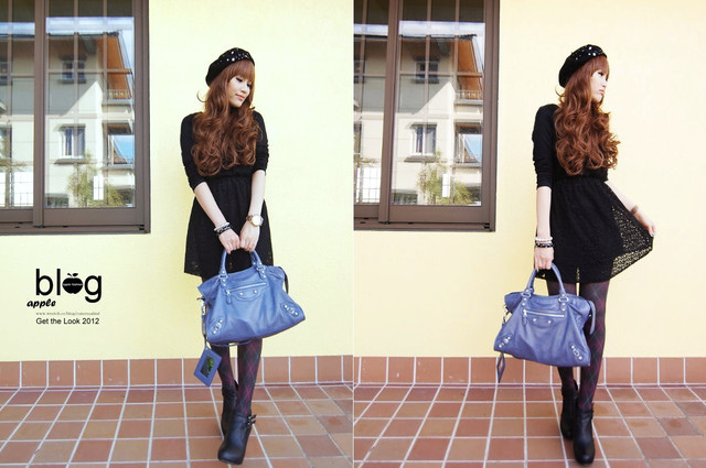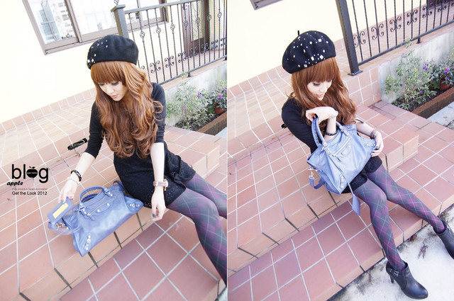第一套:黑色蕾絲洋裝X菱格紋褲襪X機車包