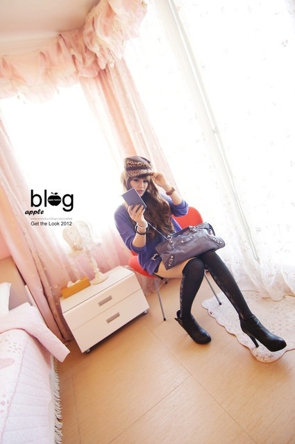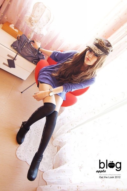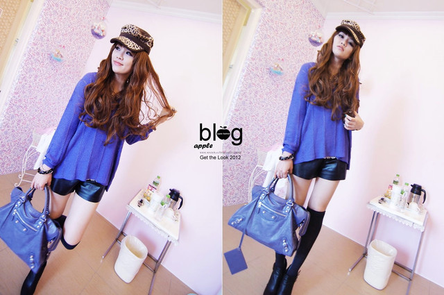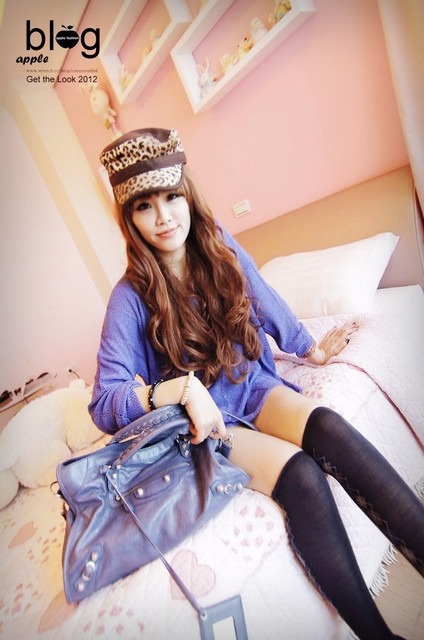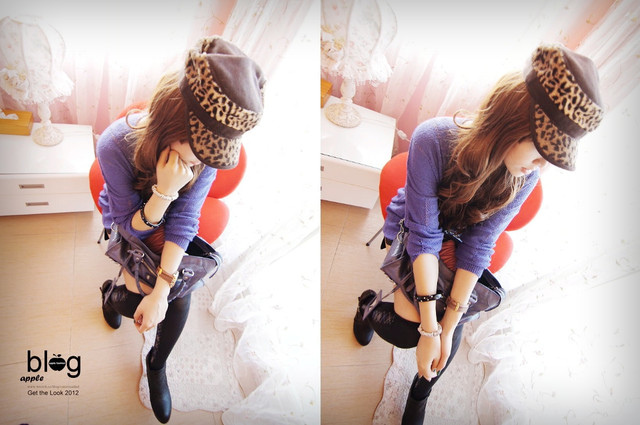 第二套:紫色針織衫X黑色皮短褲X膝上襪X豹紋帽X機車包