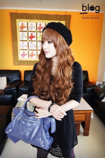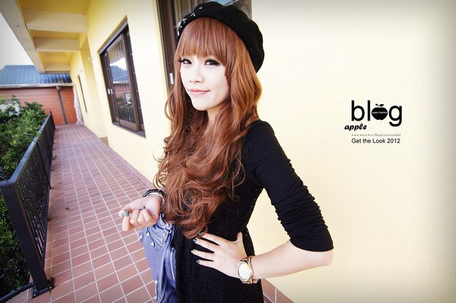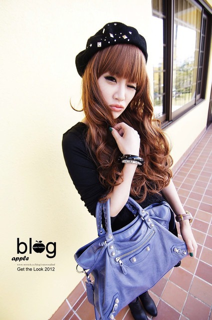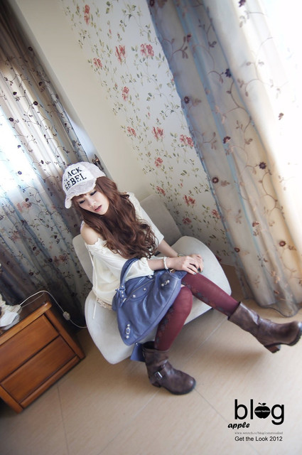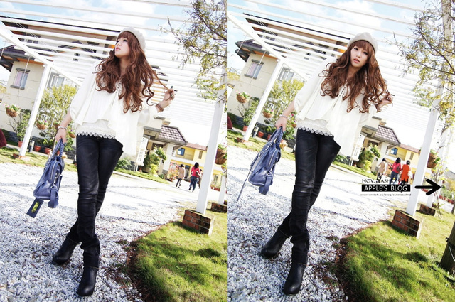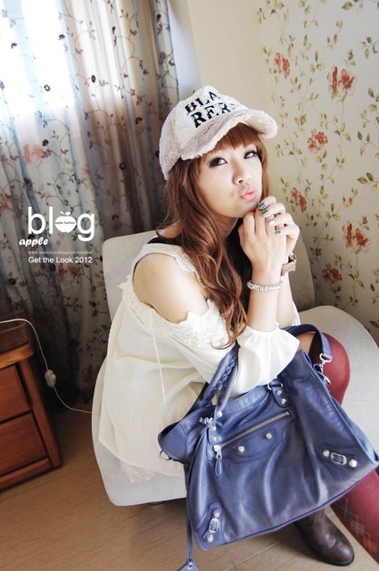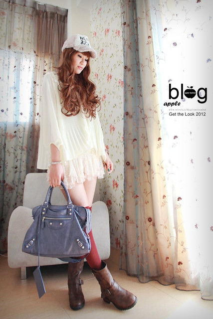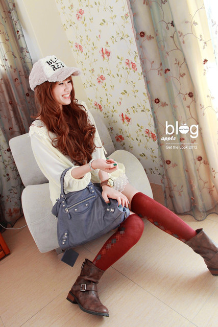 第三套:日牌雪紡罩衫X粉色褲裙X酒紅膝上襪X毛茸棒球帽X機車包