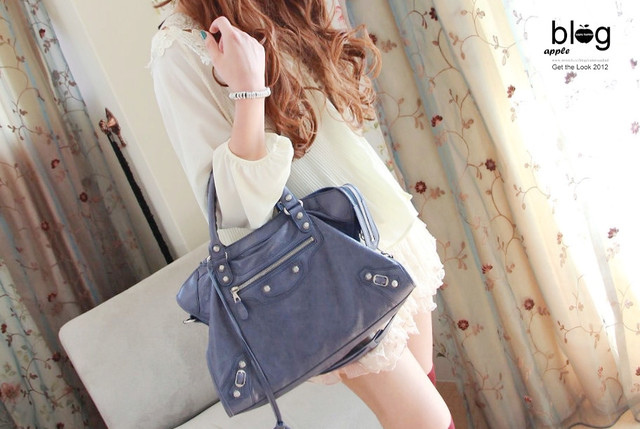 BALENCIAGA GIANT12 City 小羊皮銀釦機車包(灰藍色)