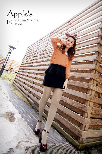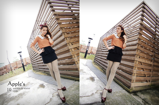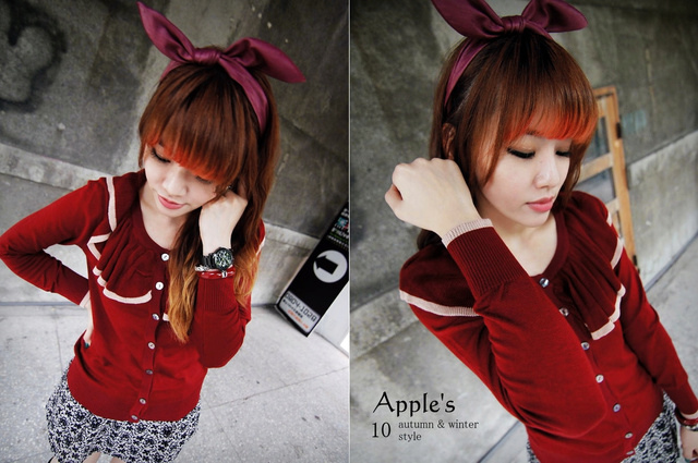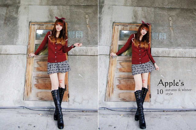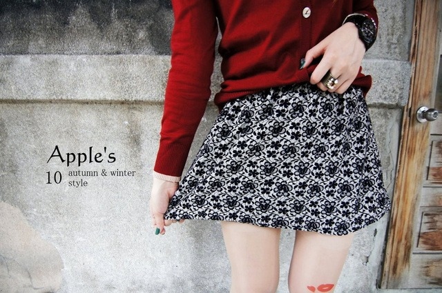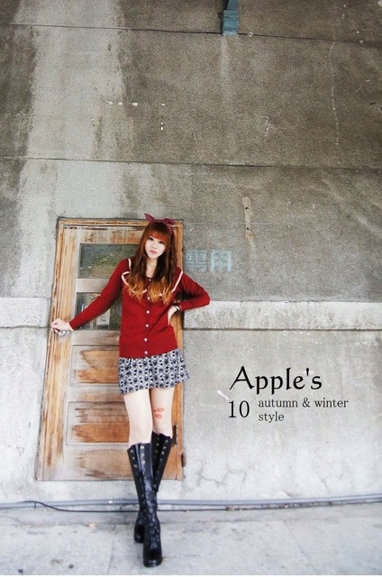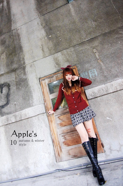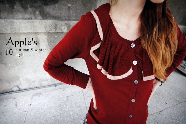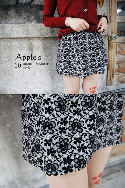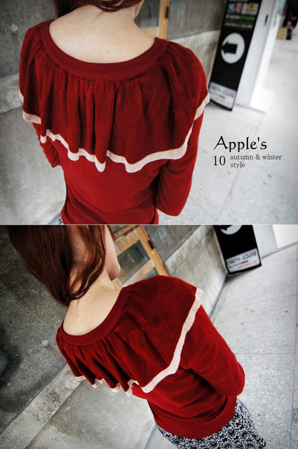 荷葉領雙色針織外套-紅 + 韓製蕾絲雕花A字裙-黑
