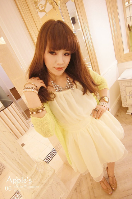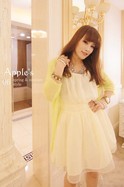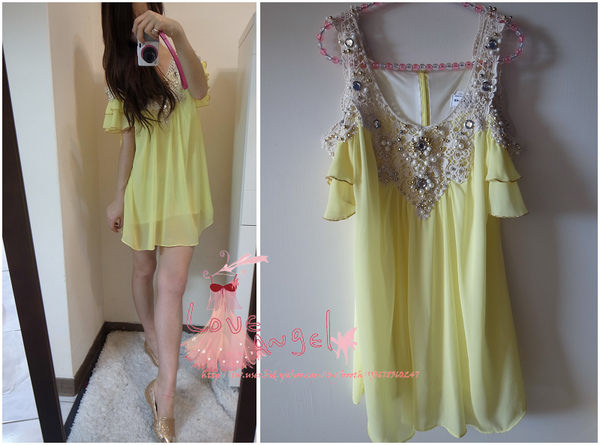 好美的鵝黃色寶石露肩洋裝