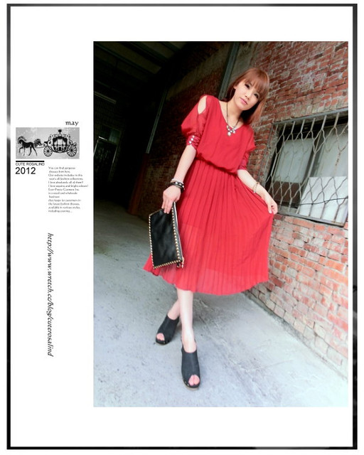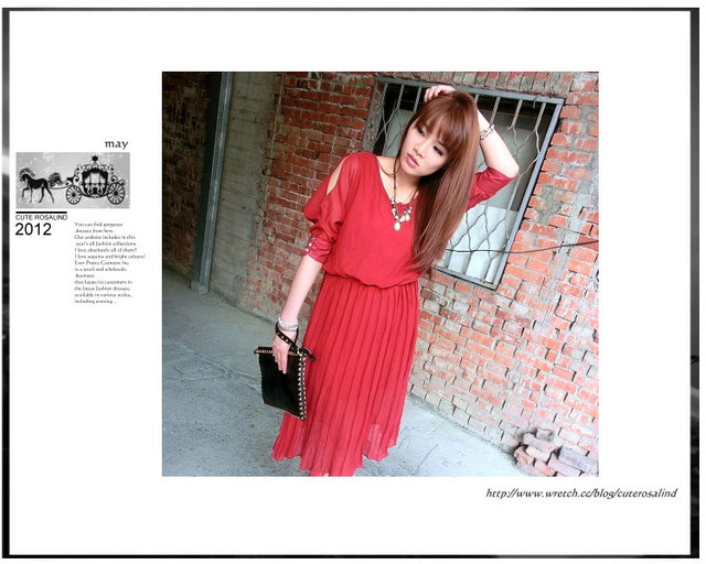 14.露肩酒紅百折雪紡連身洋裝(就是愛敗家)