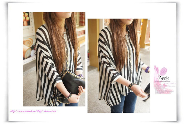 時尚剪裁直前短後長條紋雪紡魟魚襯衫