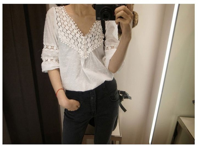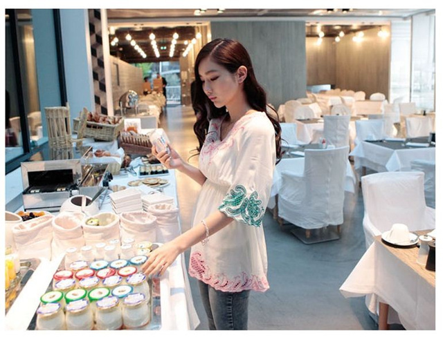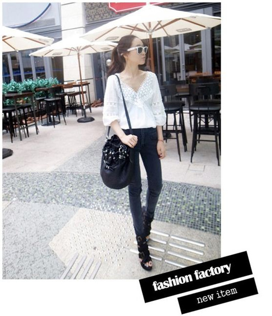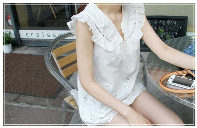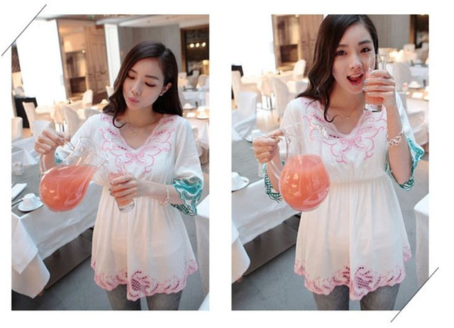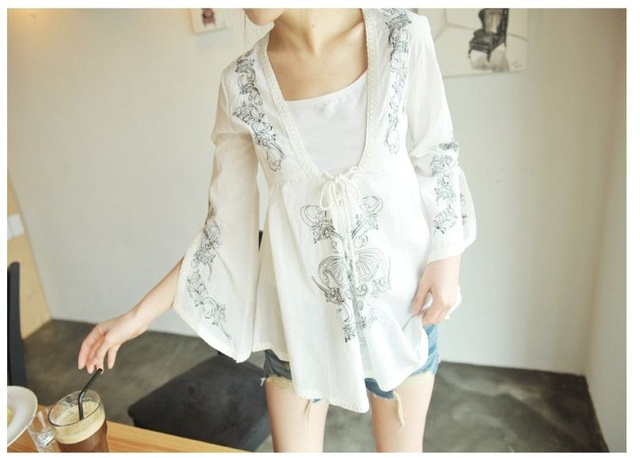 18.時尚甜美刺繡花V領裸空縮腰修身上衣