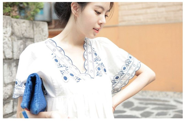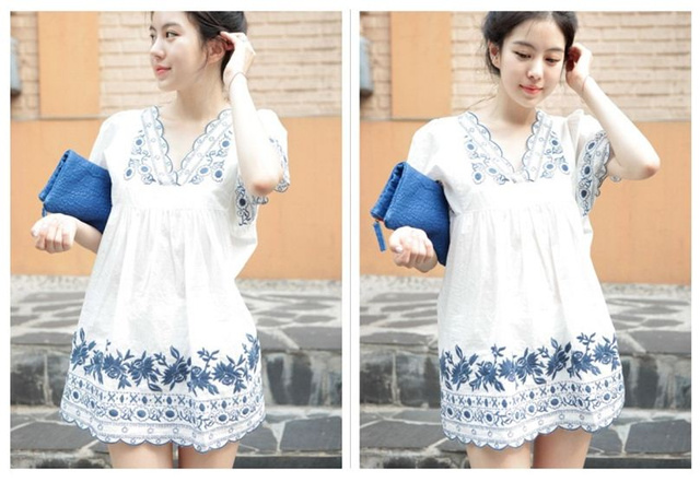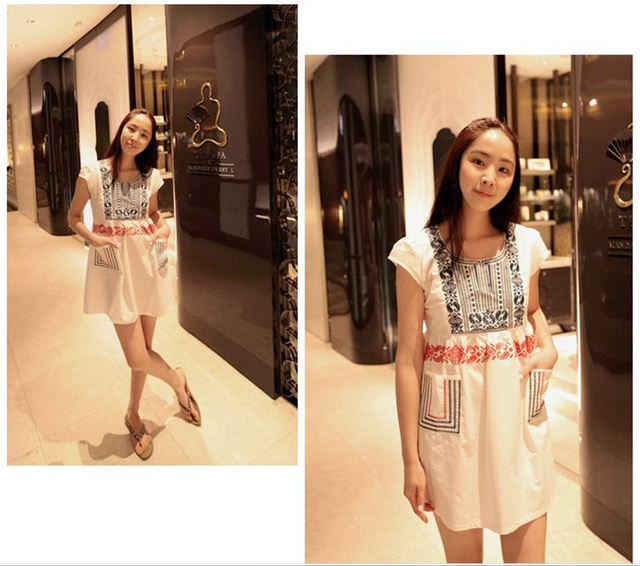 19.簡約刺繡緹花邊民俗風縮腰連身裙洋裝
