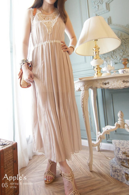 Jewellery girls‧氣質女神V型布蕾絲百摺長洋