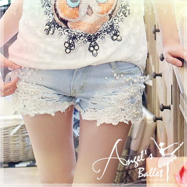 Jewellery girls‧夏日率性白釦銀線珠飾牛仔短褲