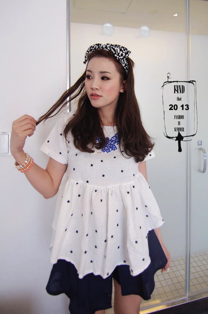 韓製圓領高腰前短後長荷葉刺繡可愛小星星短袖上衣-白