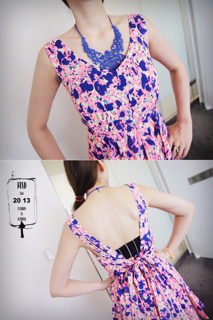韓國直送螢光碎花印花後綁帶蝴蝶結露背V領洋裝-桃花