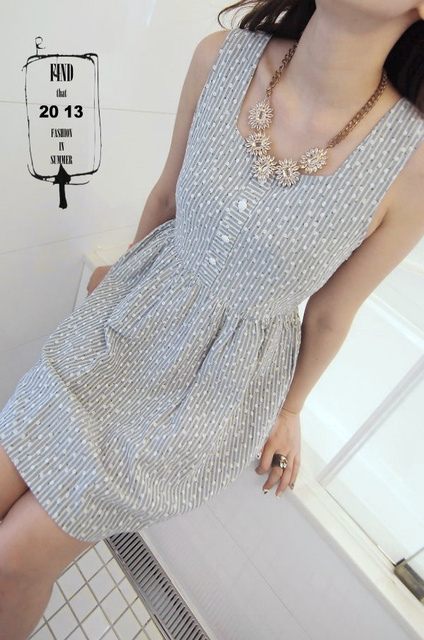 韓國立體刺繡小花佩條紋薔薇鈕扣復古V領背心洋裝-灰藍