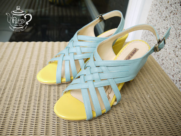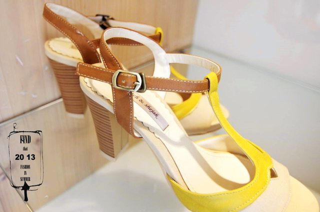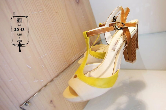 韓國帶回魚口雙色拼接T字繫帶粗跟涼鞋-黃藍