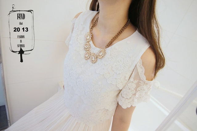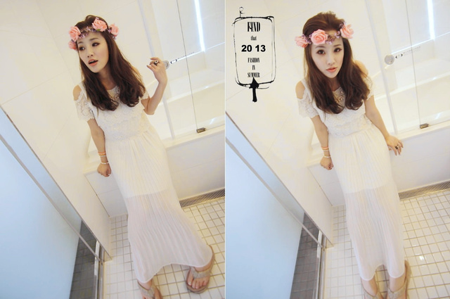 韓國連線挖肩蕾絲百摺高腰鬆緊度假風長雪紡洋裝-白