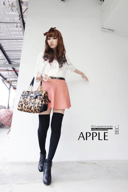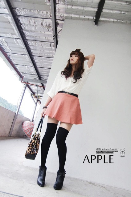 韓素面條紋混兔毛口袋寬鬆針織衫 +黑色蕾絲褲裙