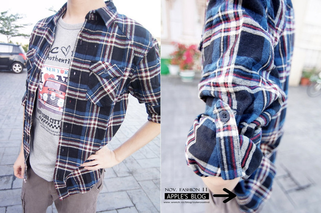 法蘭絨折袖設計格紋襯衫 - (深藍格 男M) +