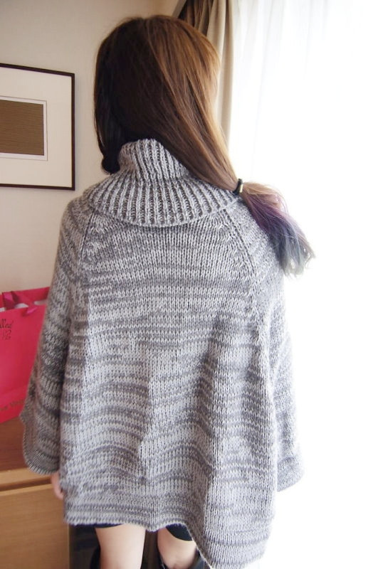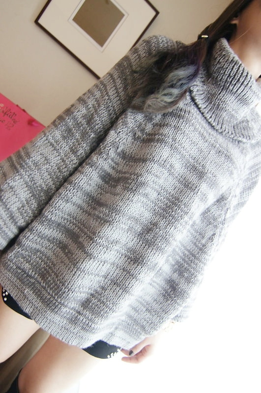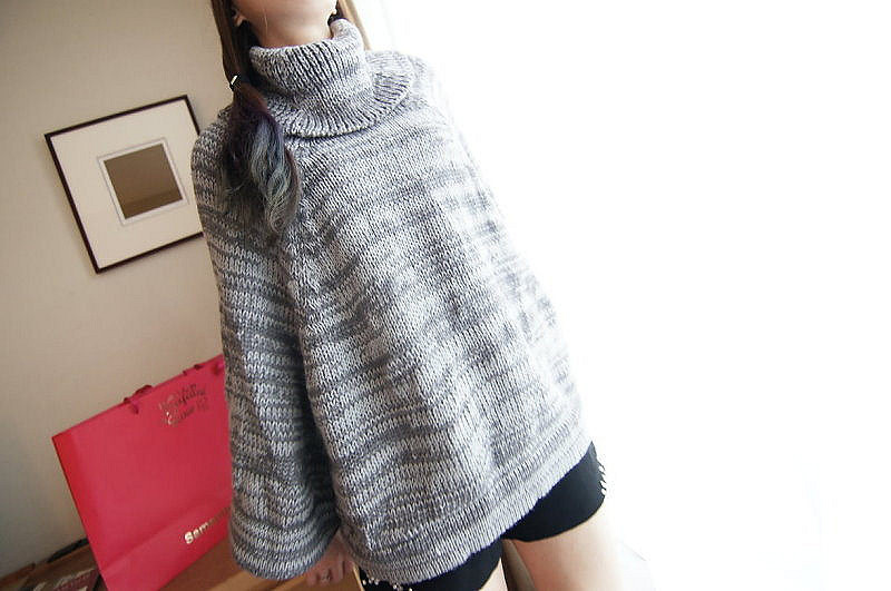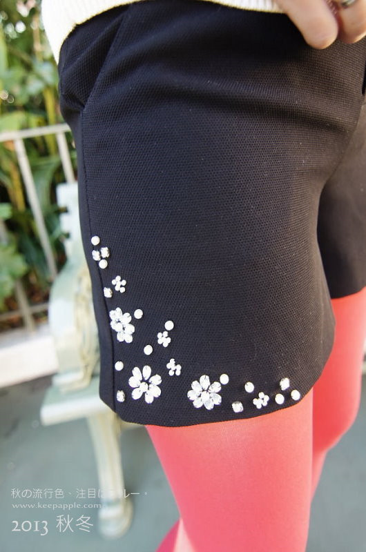 灰白毛呢色高領斗篷式上衣+手工縫製水鑽花朵裝飾黑色短褲