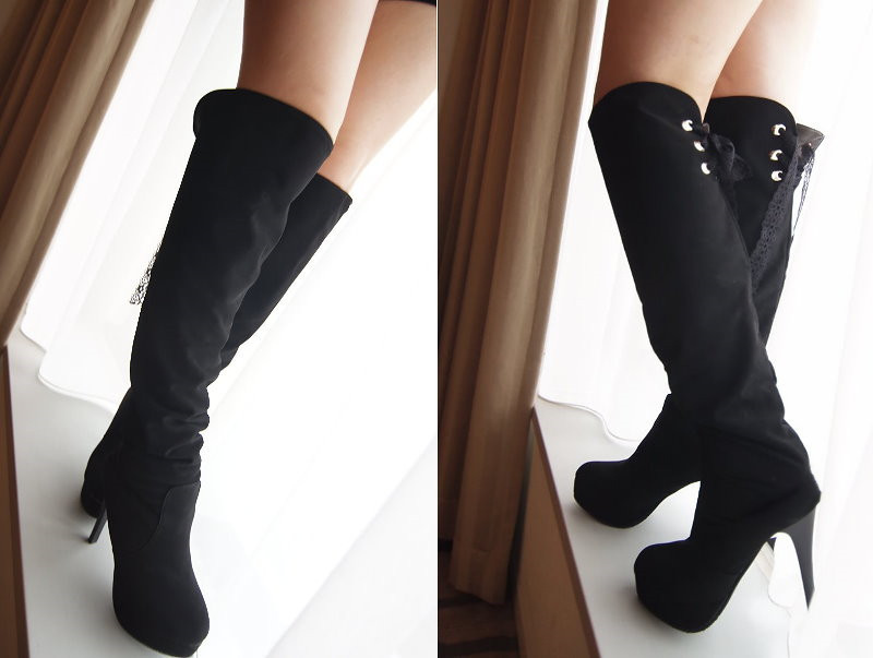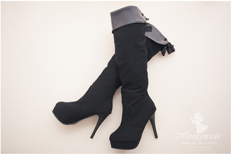 黑色後底細跟後綁緞帶過膝長靴鞋