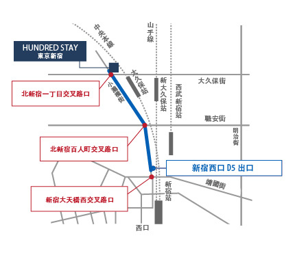 →北新宿1丁目の交差点を右折すると約50mでHUNDRED STAYの入口