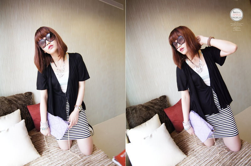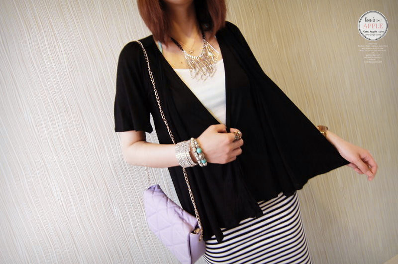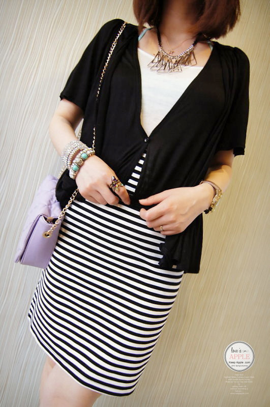 黑色飄逸感開襟上衣X內搭X條紋窄裙