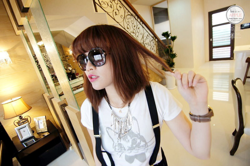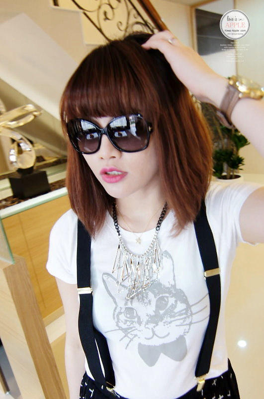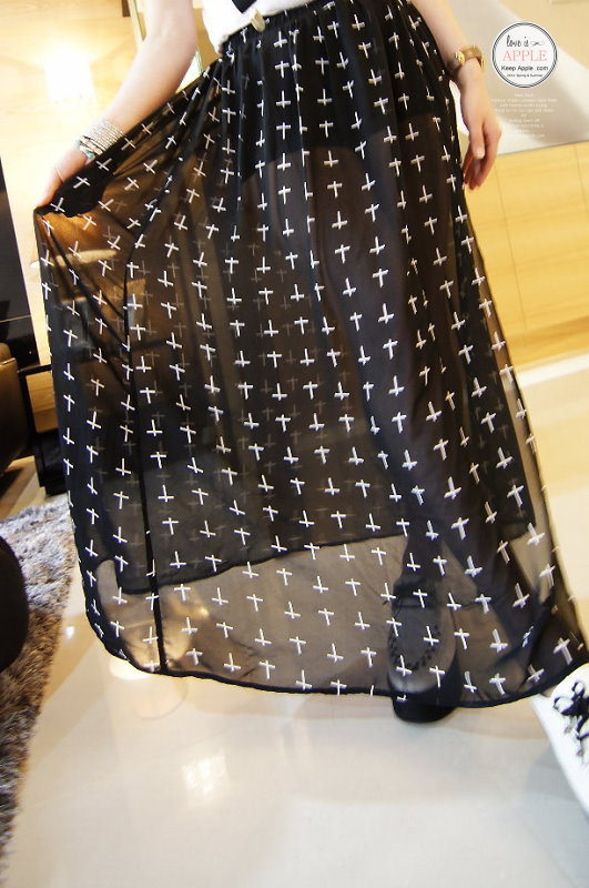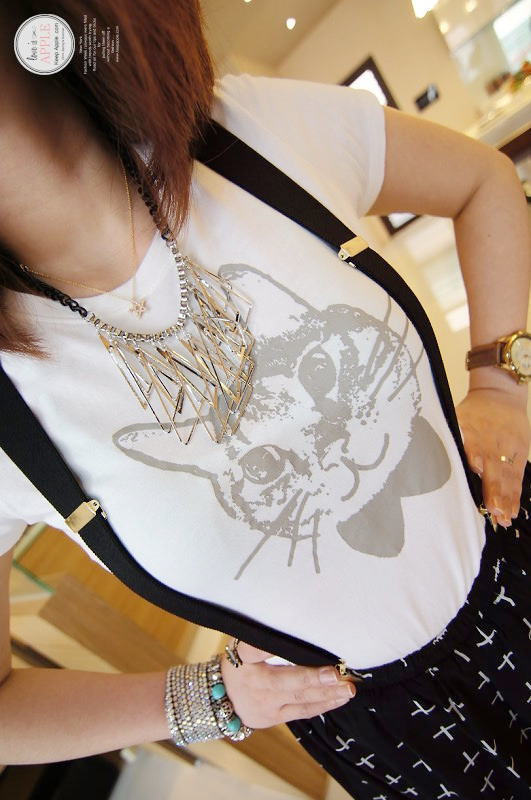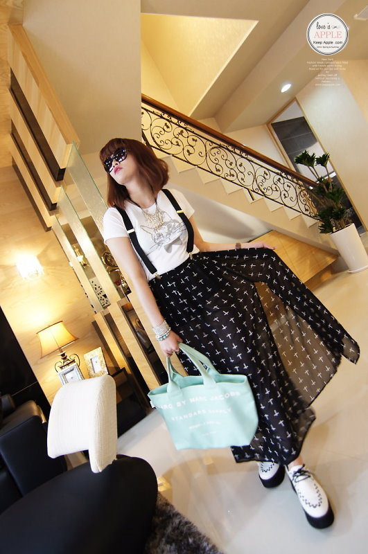 (貓咪T恤:LATIV 十字雪紡褲裙:NET 包包:MBMJ 星星項鍊:STAR BY YUN 別針項鍊:PUFII 墨鏡:TOM FORD )