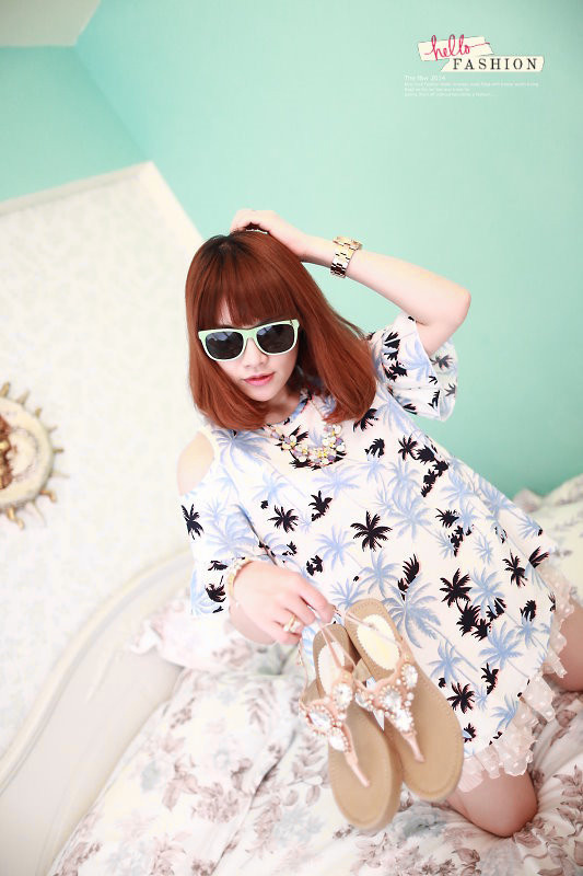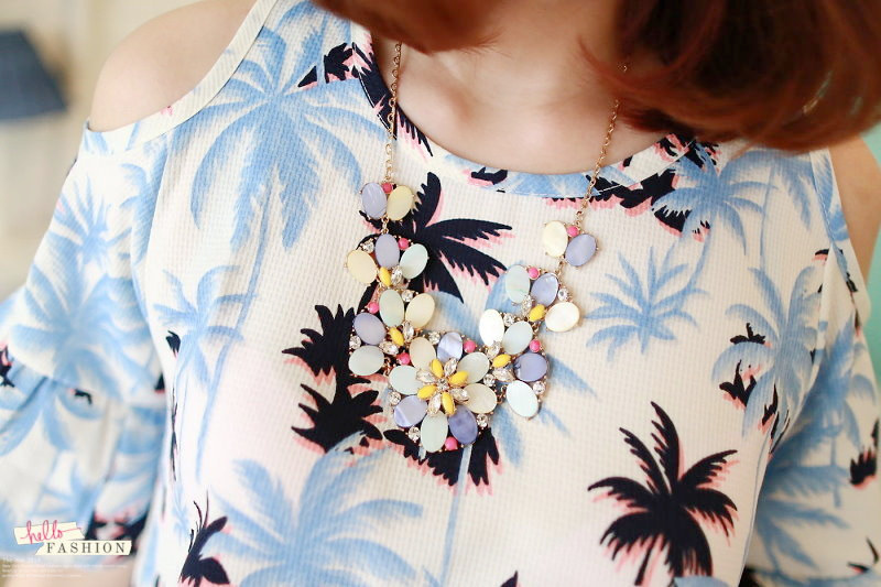 所以我穿了新買的盛夏棕櫚圖騰露肩荷葉袖短洋裝
