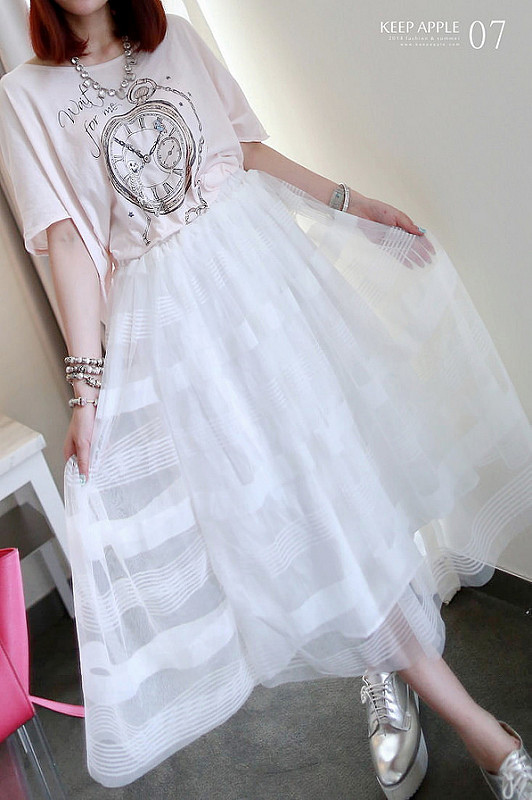 8.日牌款白色條紋層次過膝裙擺紗裙