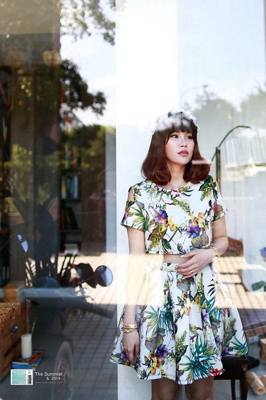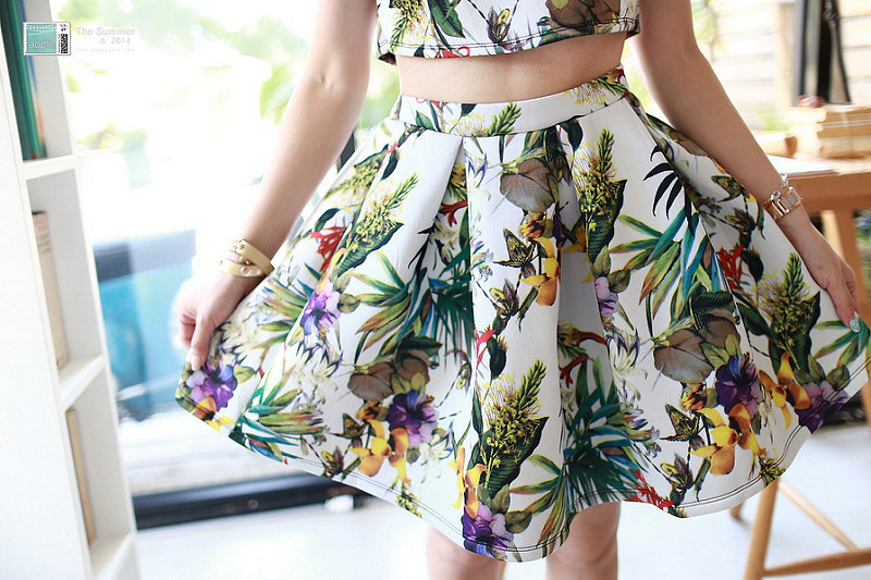 Choies Limited Edition Tropical Print Slip Sleeves Crop Top With High Waist Skate Skirt