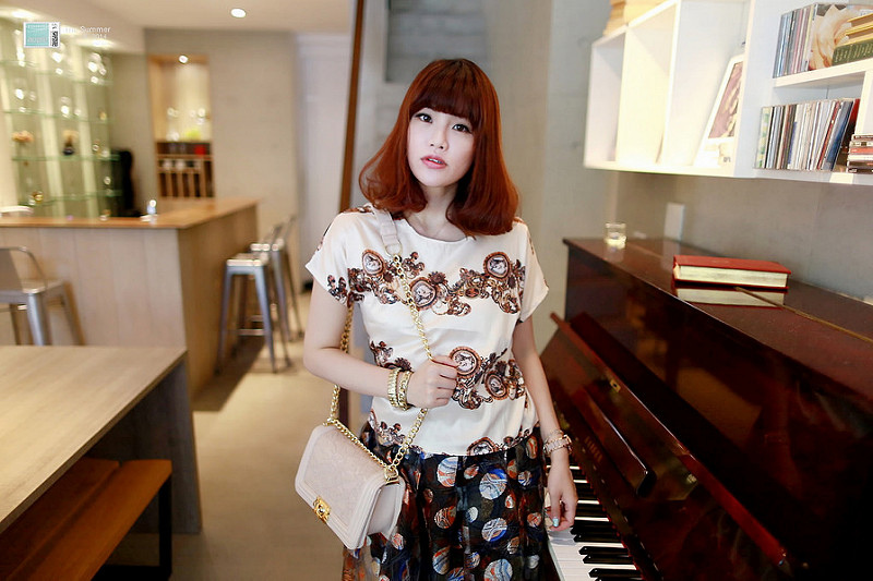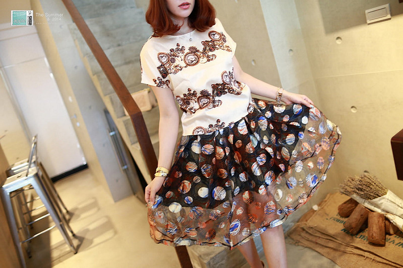 Two-Piece Suit Digital Print Top And Baroque Dot Style Skirt