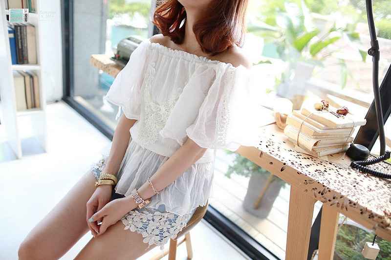 不過這件上衣阿~白色、蕾絲、一字領