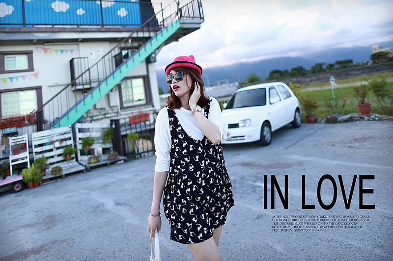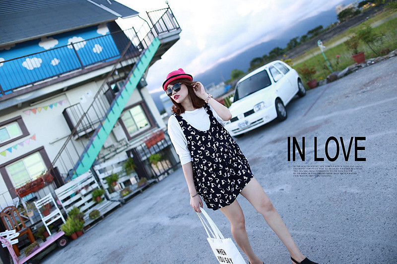 簡約的素色上衣加上滿版圖案背心裙