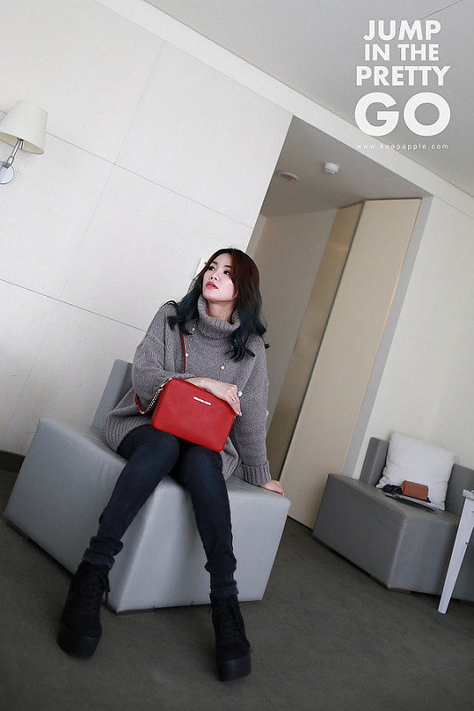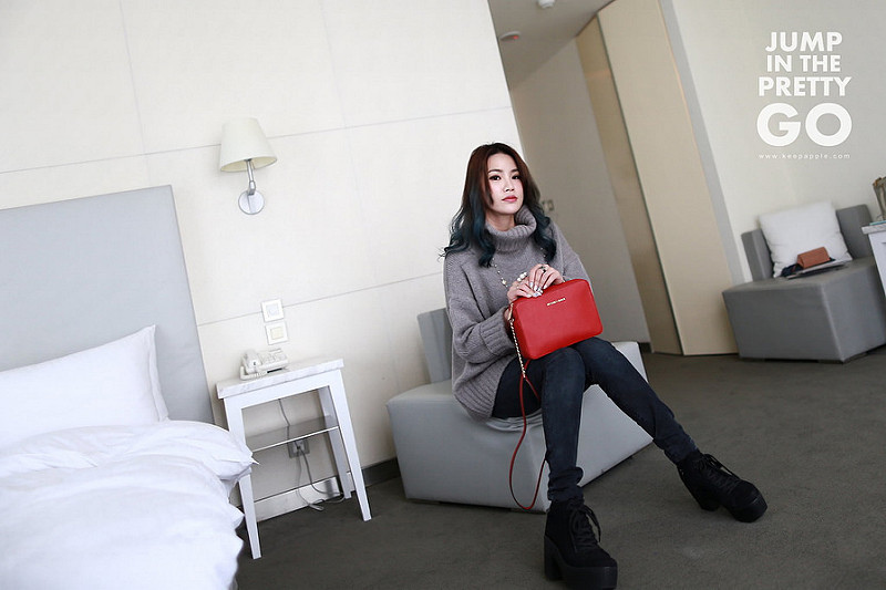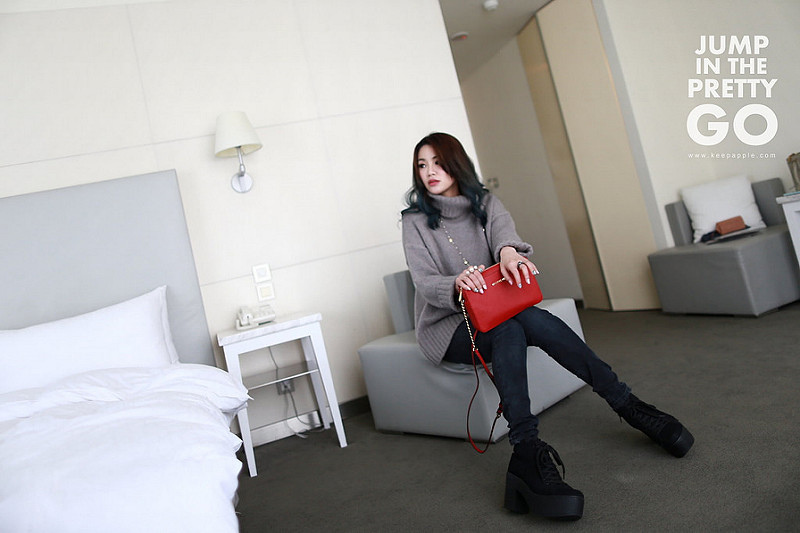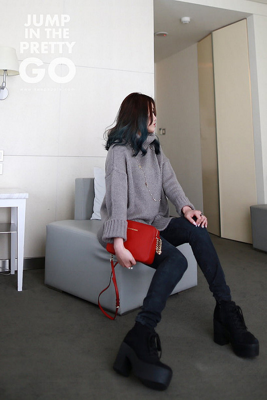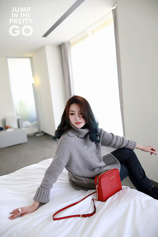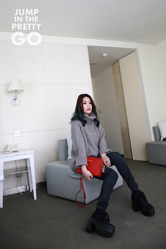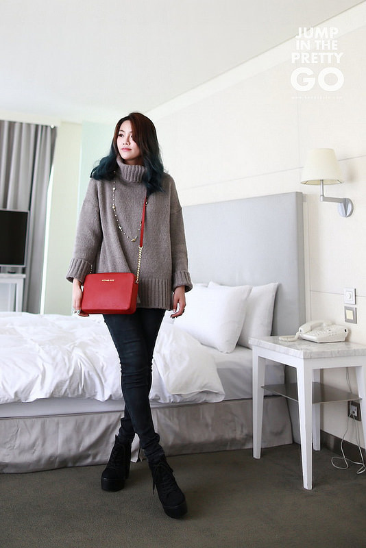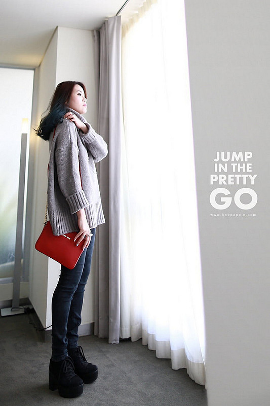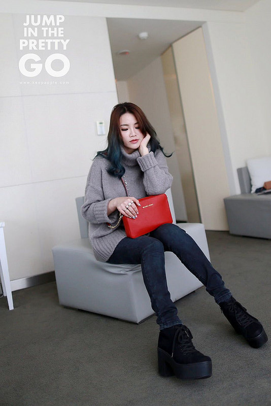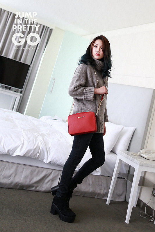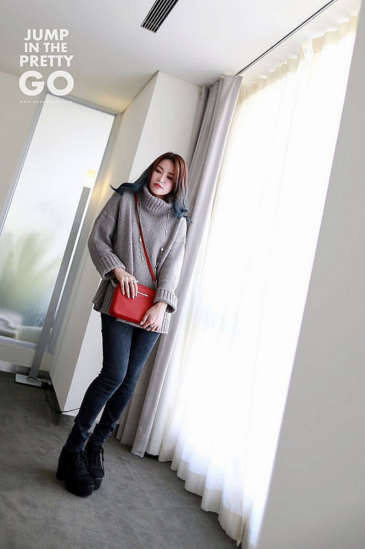 就是灰色高領毛衣+黑灰色內搭褲+綁帶靴這樣