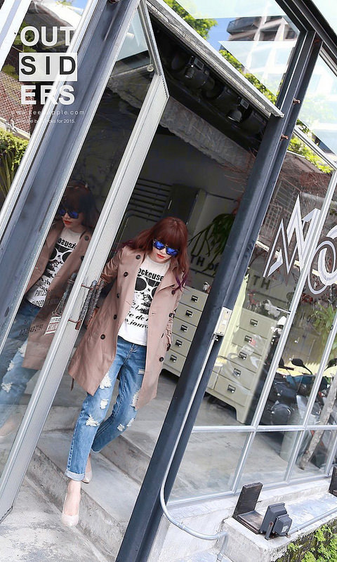 第三套:風衣外套 X 白色圖案T X 男友破褲 X 金色高跟鞋