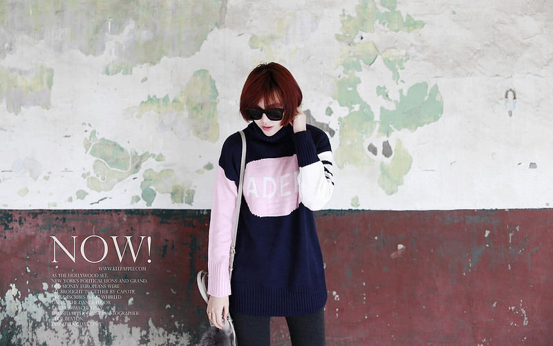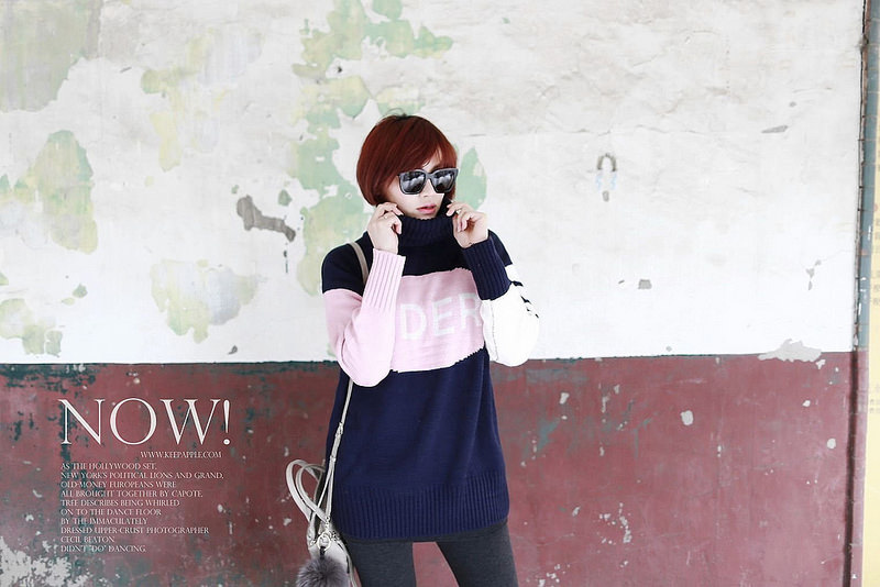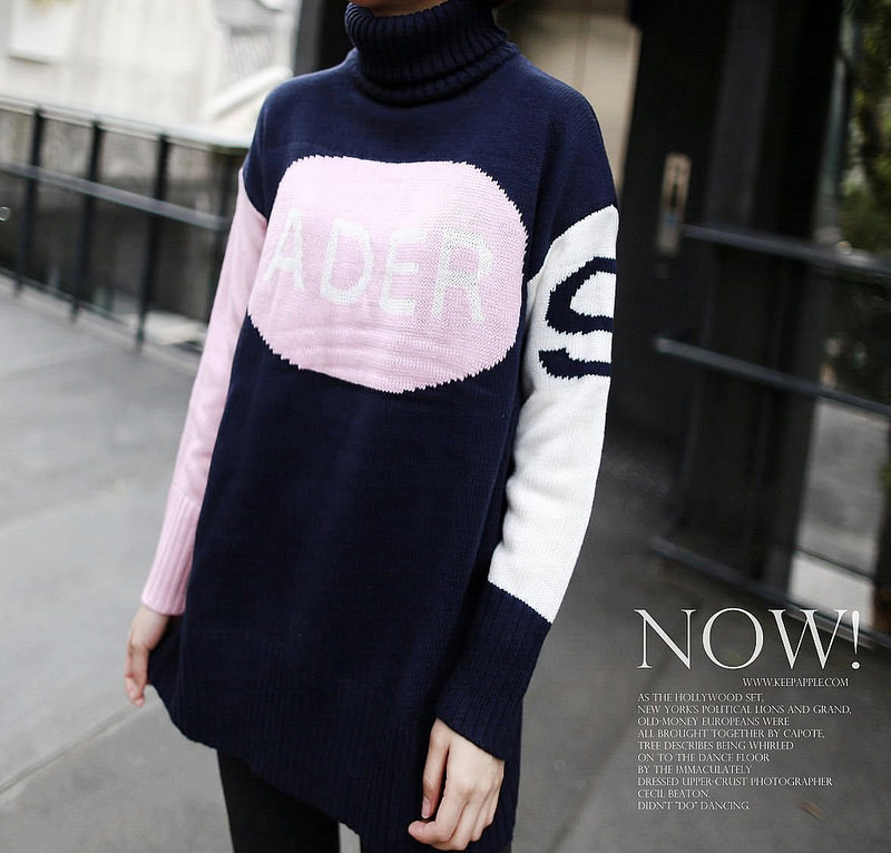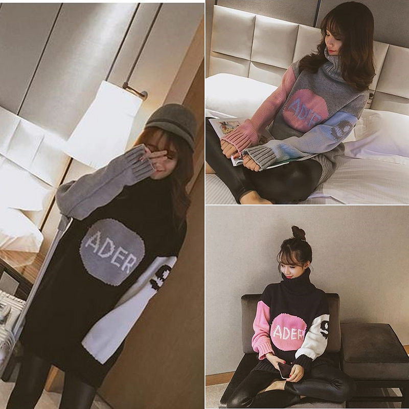 拼色字母高領套頭毛衣+加絨加厚假兩件包臀內搭褲