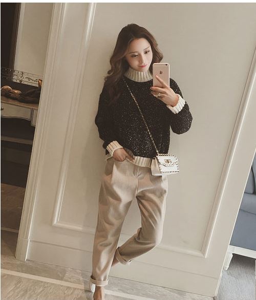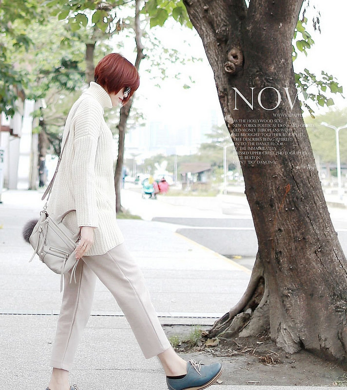 側開衩粗棒針織高領罩衫上衣+挺版毛呢打褶西裝褲