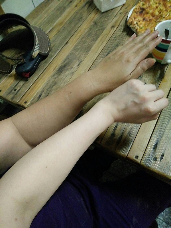 休息時候和老媽一比我們兩個手臂膚色