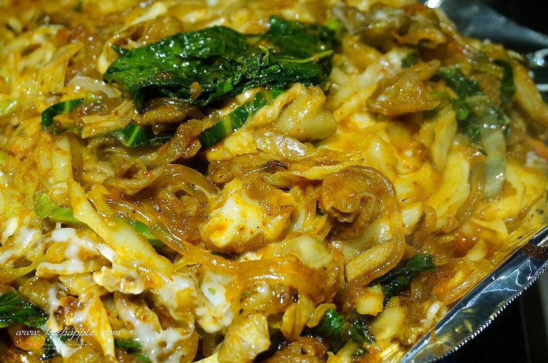 鋪上一層辣醬、卷心菜、紫蘇葉、年糕、小腸、粉絲,
