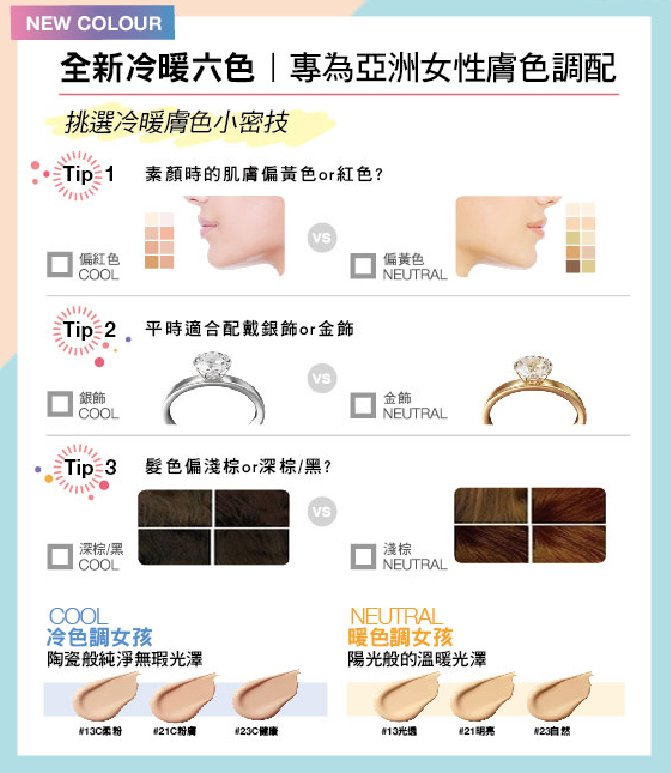 暖色:13光透 21明亮 23自然 冷色:13C柔粉 21C粉膚 23C健康
