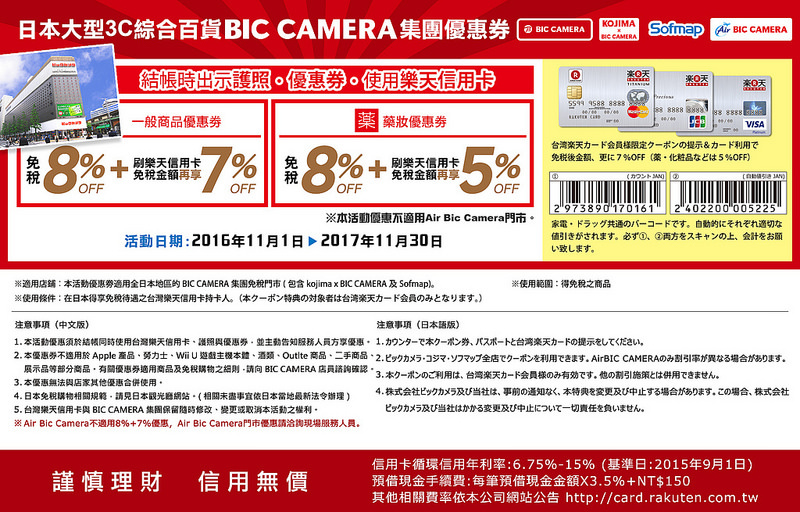 大國藥妝出示優惠券並刷卡滿五千日幣,免稅8%再享2%折扣