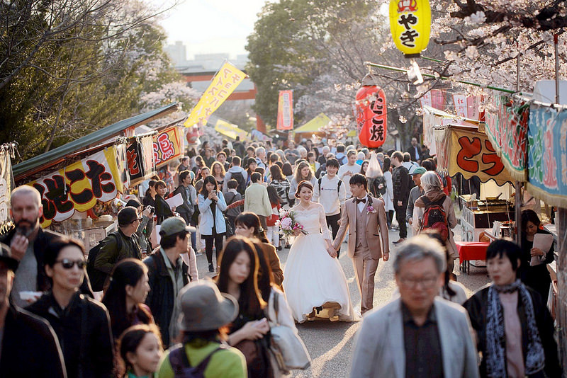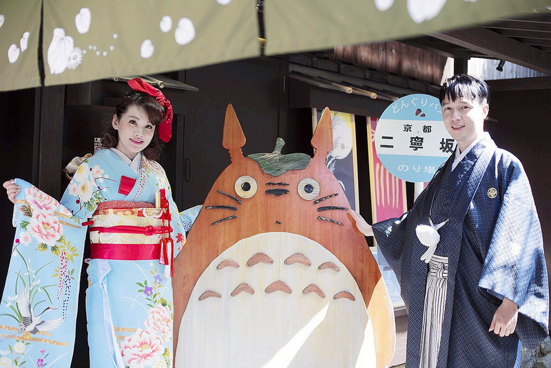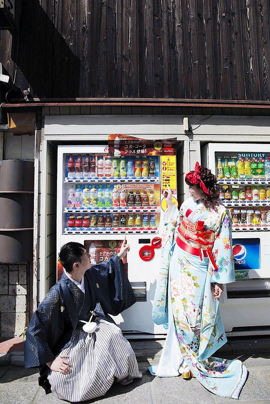 西式的禮服配色古色古香的日本古都景色反而有美麗的衝突感