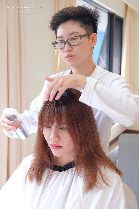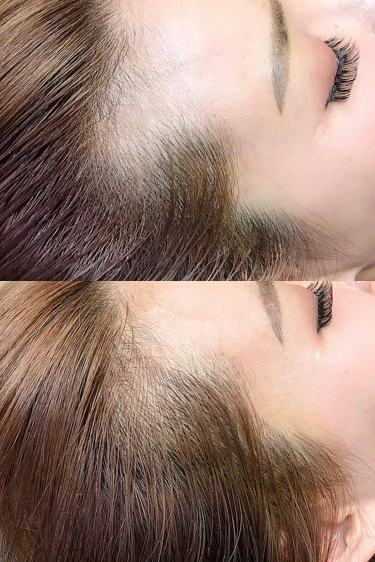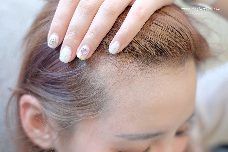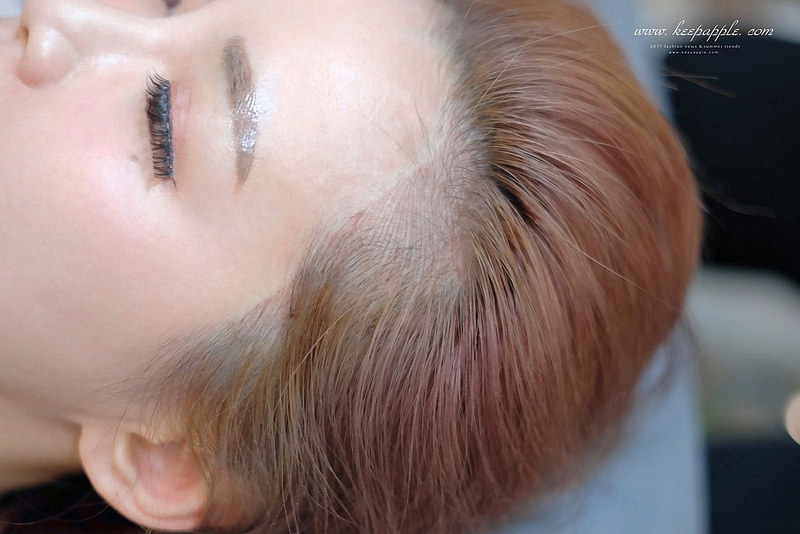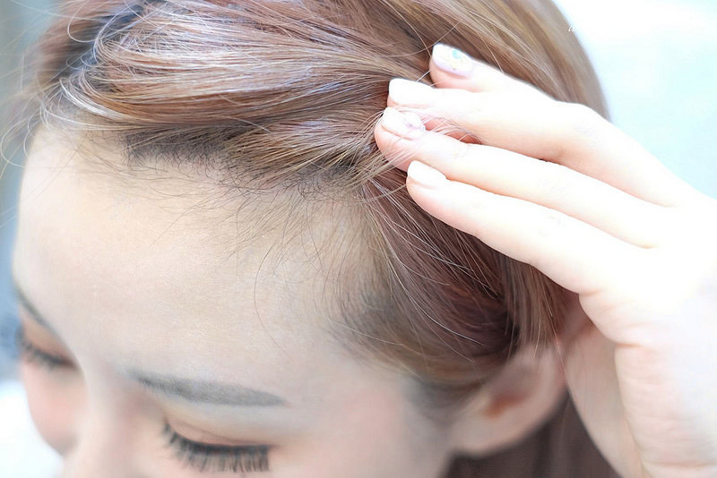 順著髮流生長方向,用跟頭髮顏色深淺接近的色乳在頭髮稀疏、空洞處