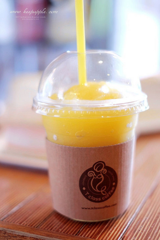 飲料是芒果汁、柳橙冰沙和冰拿鐵