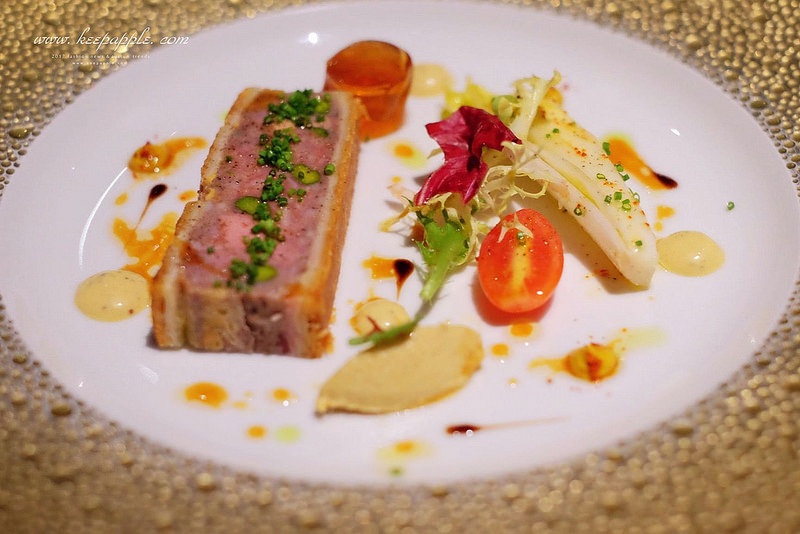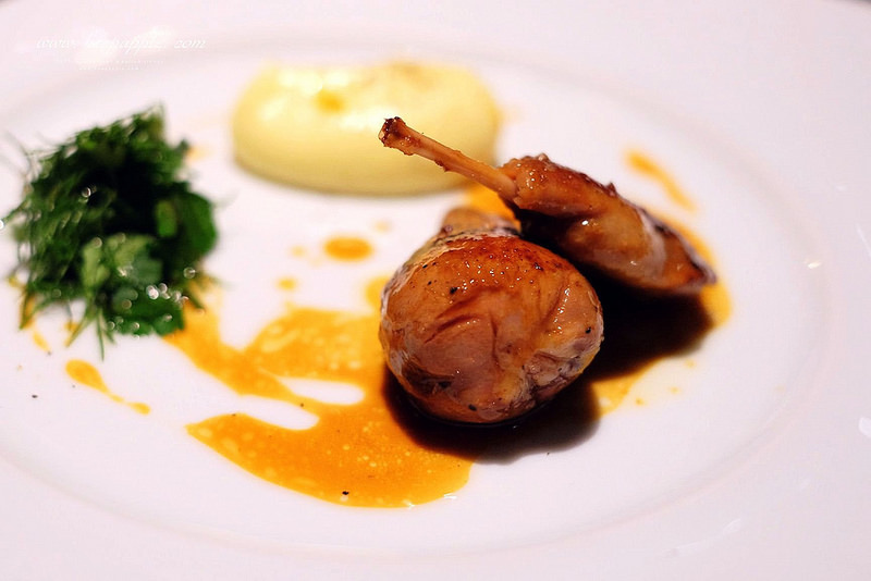 Apple 的主菜之二「鵪鶉鑲鴨肝佐洋芋泥」
