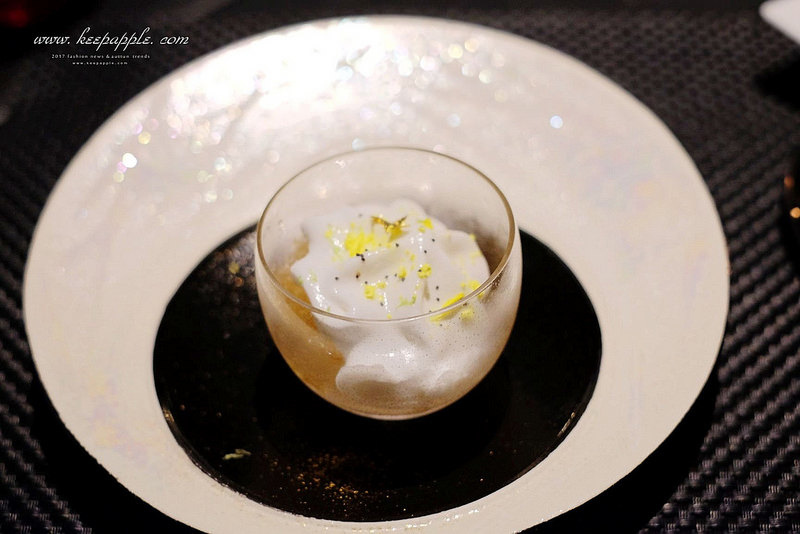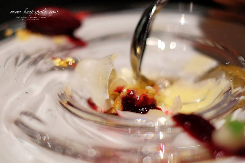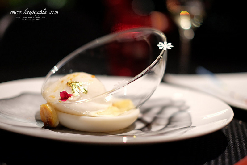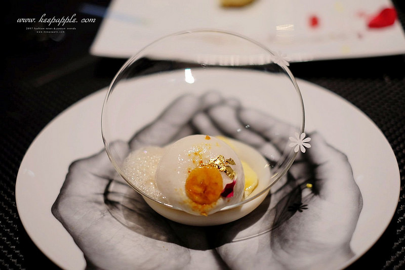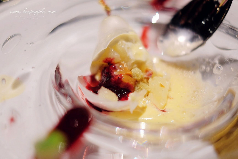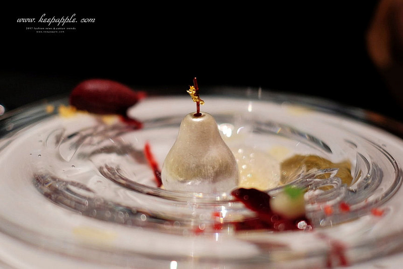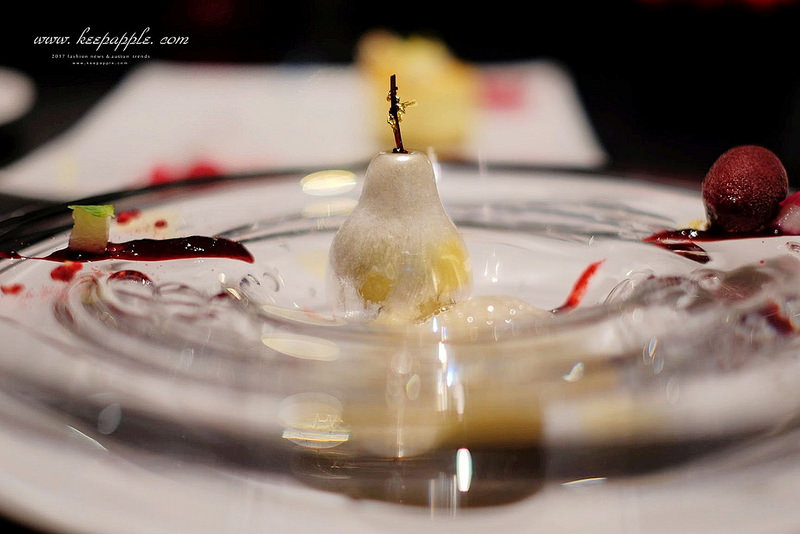 這一道叫作「珍珠糖球鑲焦糖洋梨慕絲佐黑醋栗冰沙」