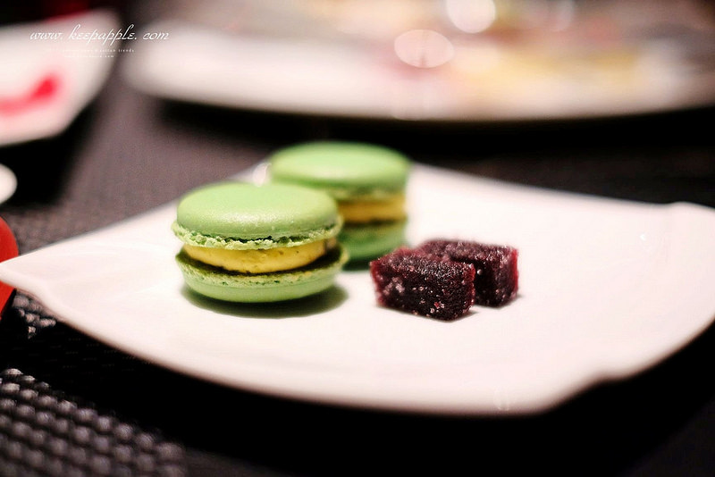 搭配熱飲會給上面的開心果馬卡龍和水果軟糖