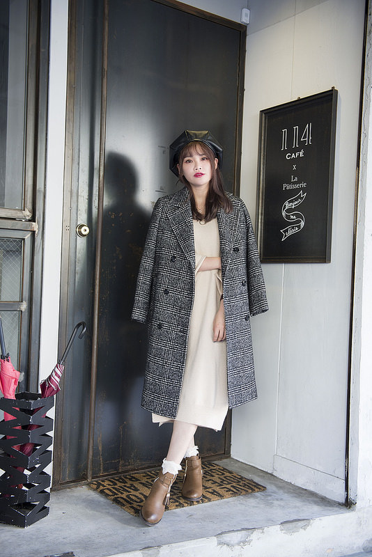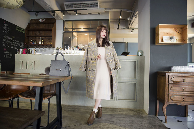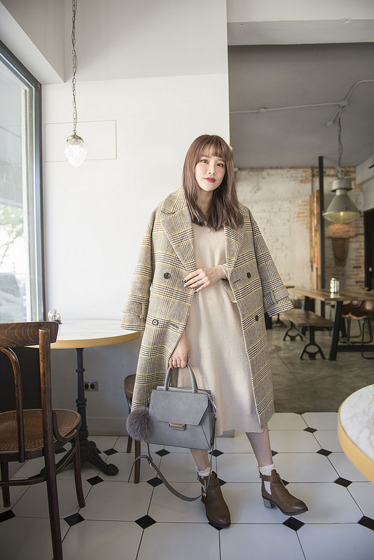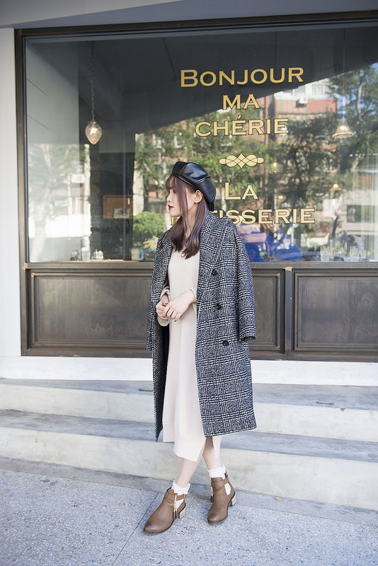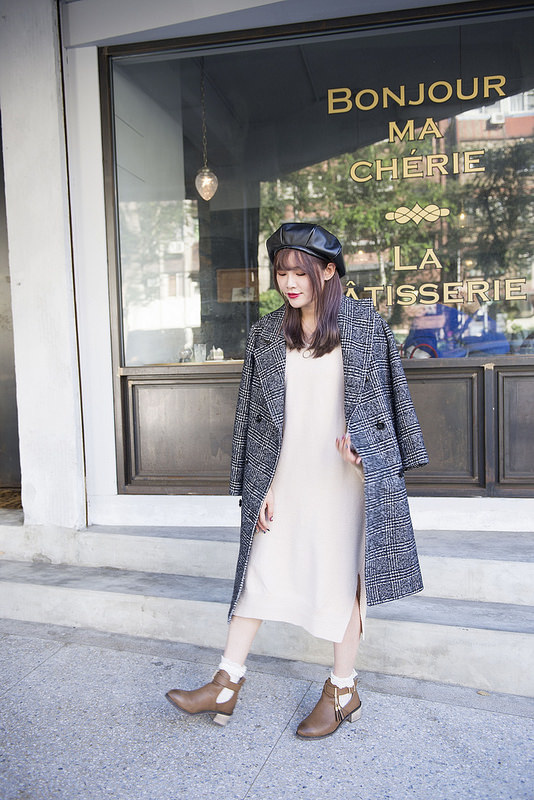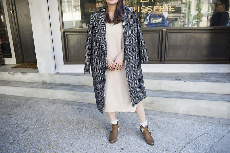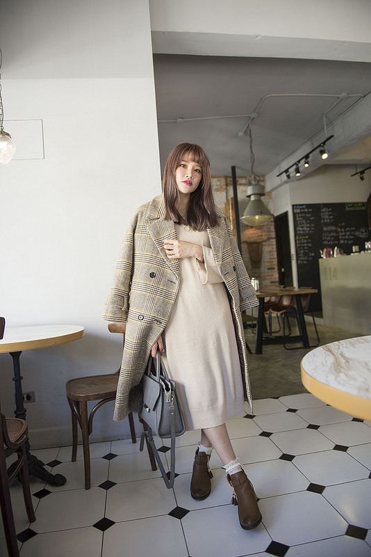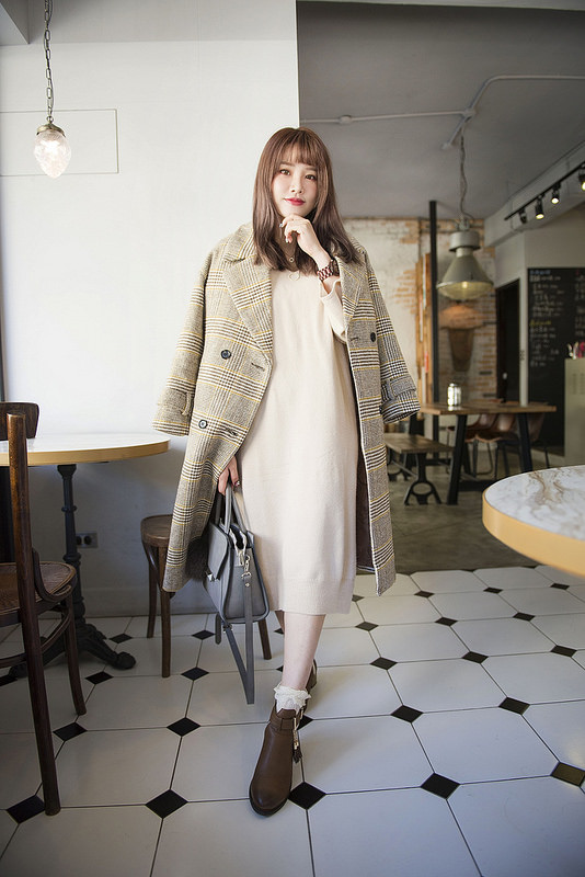 就是格紋大衣+奶油色針織洋裝+小短襪+短靴這樣而已