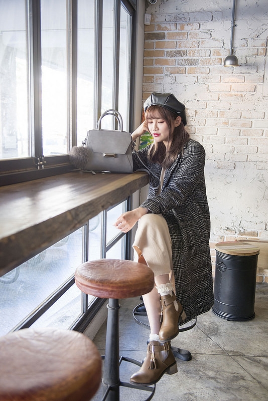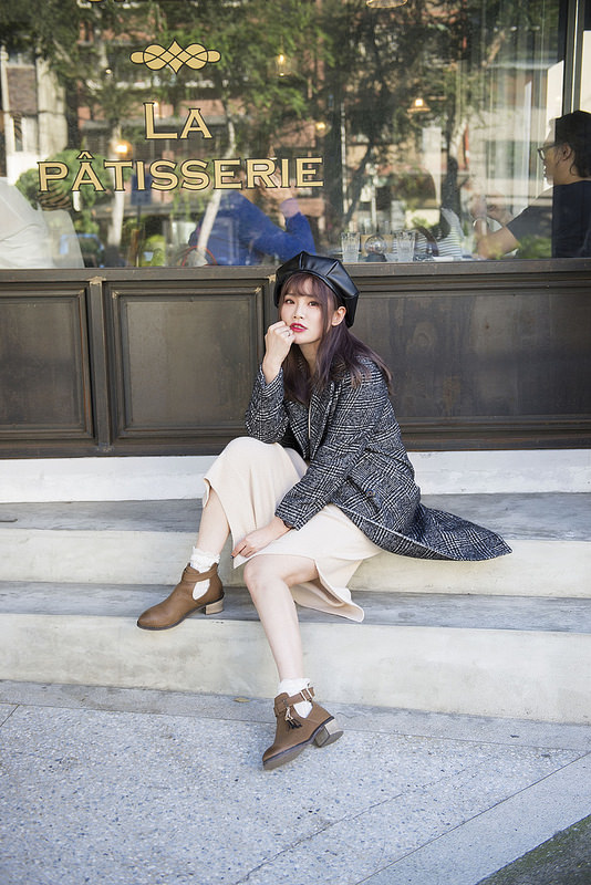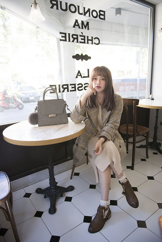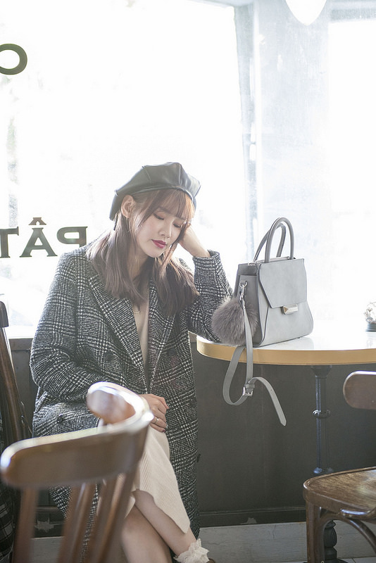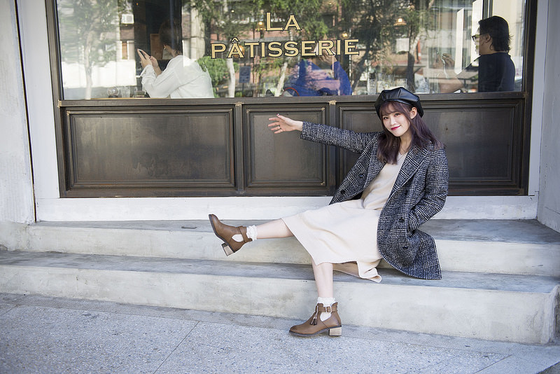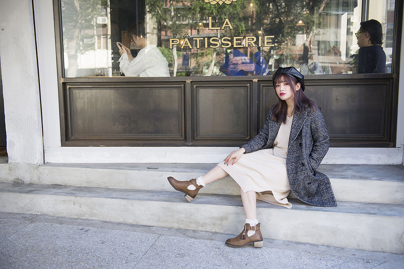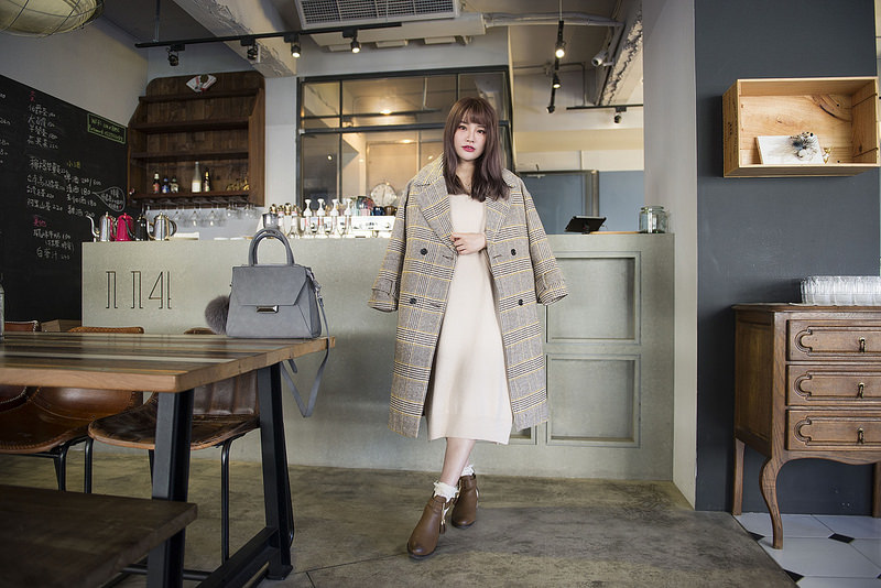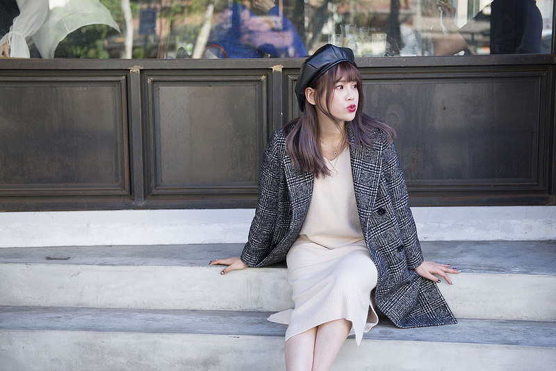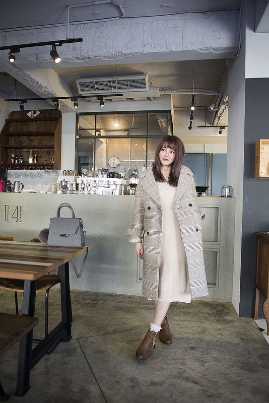 就是格紋大衣+奶油色針織洋裝+小短襪+短靴這樣而已