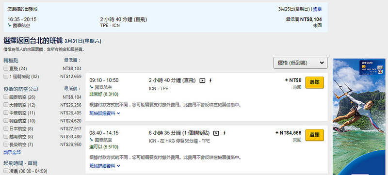 不同的航班會依照價格高低來排序