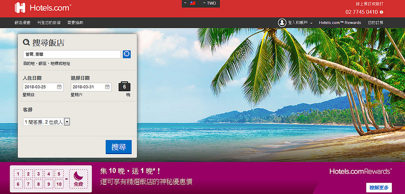 HOTEL.COM 有「集十晚送一晚」